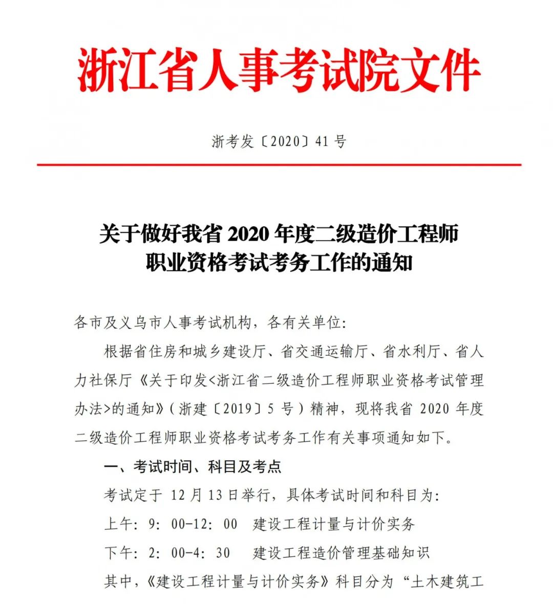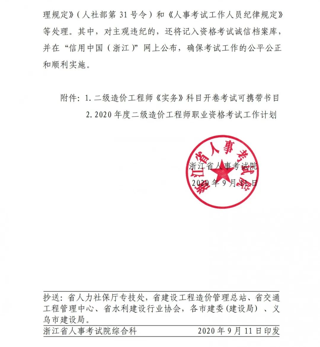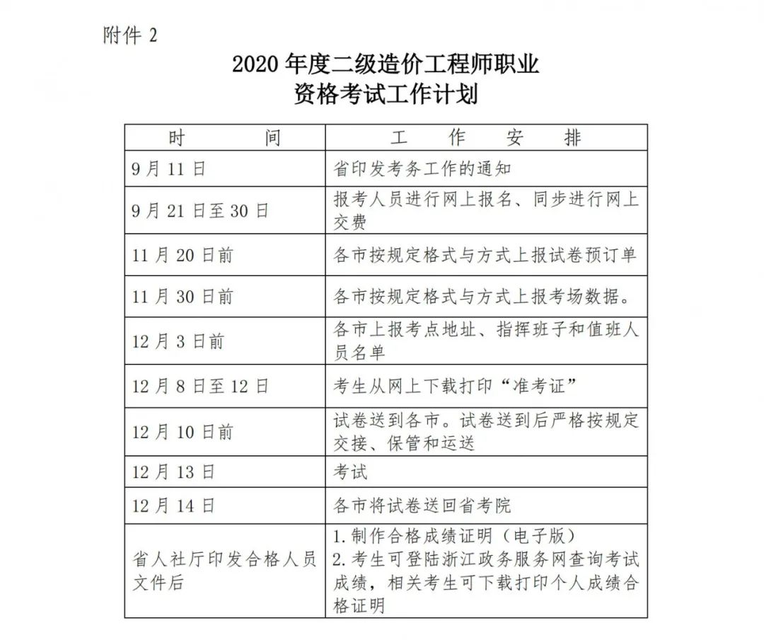 关于做好浙江省2020年度二级造价工程师职业资格考试考务工作的通知